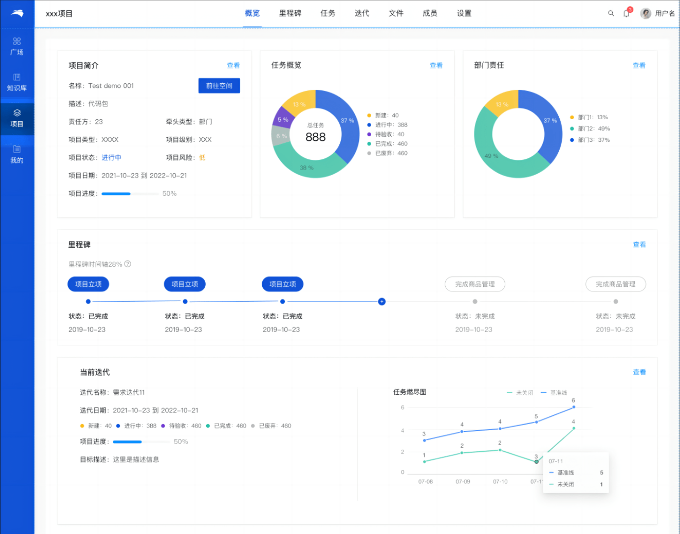 囊括了立项及立项后的任务发布、迭代、文件(知识沉淀)、里程碑、再到成员权限设置等管理模块;首页项目概览可实时查看项目任务进度情况;