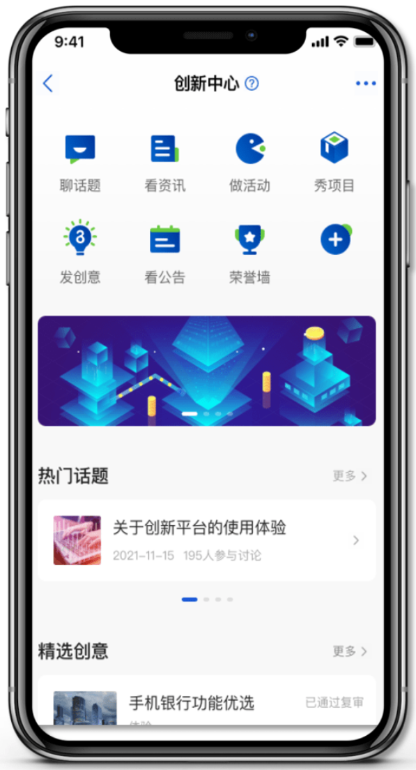 创新信息中心APP是一个创意孵化、讨论和汇聚的互动交流平台。为行内大众提供了话题、创意、项目、资讯、活动等功能,用户通过参与创新话题、查看创新资讯、报名创新活动、浏览项目空间等活动和平台信息产生互动,通过不同业务信息的发布,让用户能够进行沟通交流,激发创意的产生。