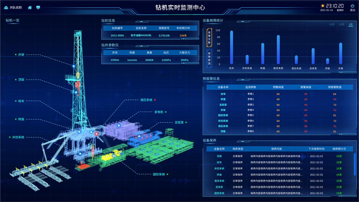 根据数据模型的实时状态,可实时监视立管压力、泥浆泵、转盘扭矩、绞车、钻井液压等参数极其异常各类工程事故,实现安全作业。