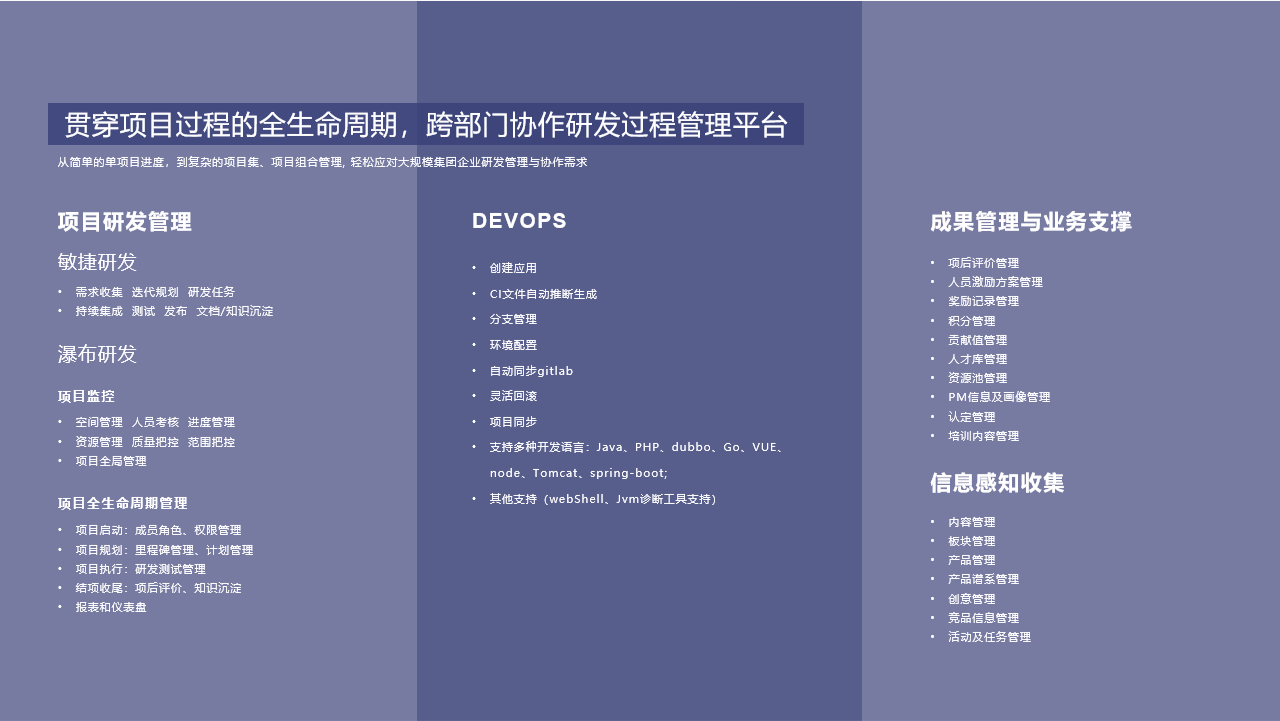 主要用于引导用户进入项目空间、项目知识、项目管理、项目运营等系统工具 ,将以上系统有机整合,最终形成一套集立项计划、项目执行、项后解析“三位一体”的系统化解决方案。