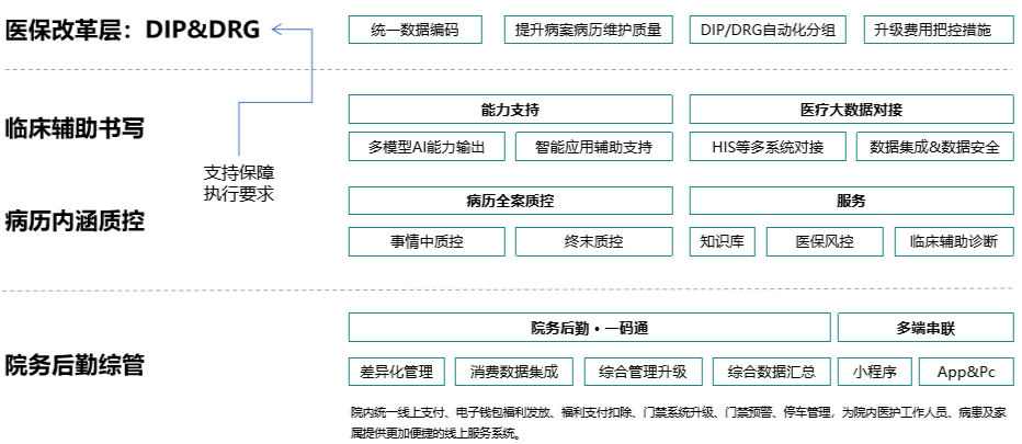 医保DIP、DRG支付方式改革为先行,以临床辅助书写及病历内涵质控为重要辅助模块,而后有院务后勤综合管理方案为医务人员、病患、乃至整个医院提供便利的工作及生活服务。