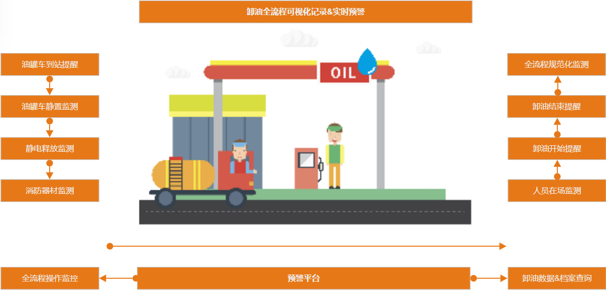 卸油作业监测及安全措施预警平台 卸油作业检测及安全措施预警平台的建设,将以卸油全流程可视化记录为基础,实现油罐车到站提醒(前端提醒和后端销售公司提醒)、油罐车静置监测、静电释放监测、消防器材监测、人员在场监测、安全警示设施监测、卸油开始提醒、卸油结束提醒等多维度功能。此平台的建立将有效缓解加油站卸油过程管理困难,解决加油站卸油全流程可视化过程归档问题,促进加油站智能化建设,提高加油站卸油安全性,切实解决加油站卸油监测问题。 咨询解决方案及报价
